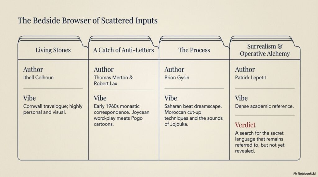- Ithell Colhoun’s Living Stones – all about Cornwall, one of her travel books. Again, like her Goose of Hermogenes, quite personal and visual.