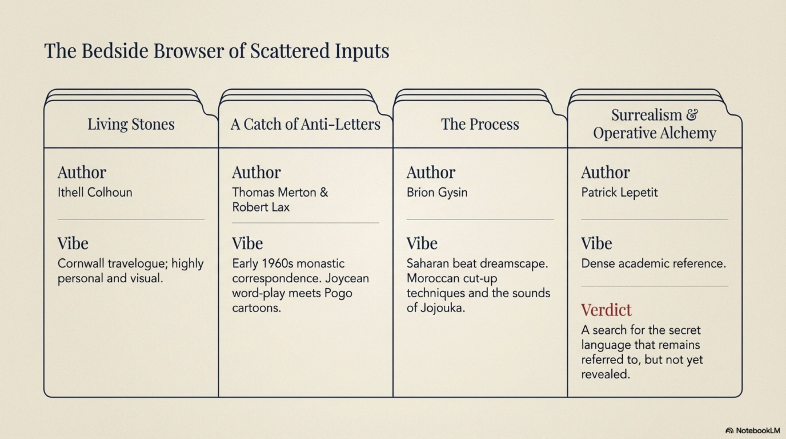 - Then there is The Process, by Brion Gysin, a classic cut-up-technique Saharan beat dreamscape, all happening in Morocco or across the desert, sounds of Jajouka and visions of paradise along with ominous portents and transfigurations. I’m reminded of my early days as a reader, looking to the beats for inspiration. And I love the Sufi atmosphere, even if here it’s clouded in kif smoke.